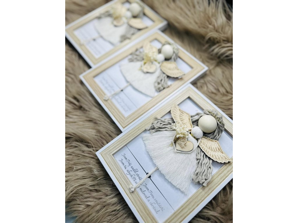 Anděl v rámečku s dekorem dřeva s textem uvnitř rámečku.