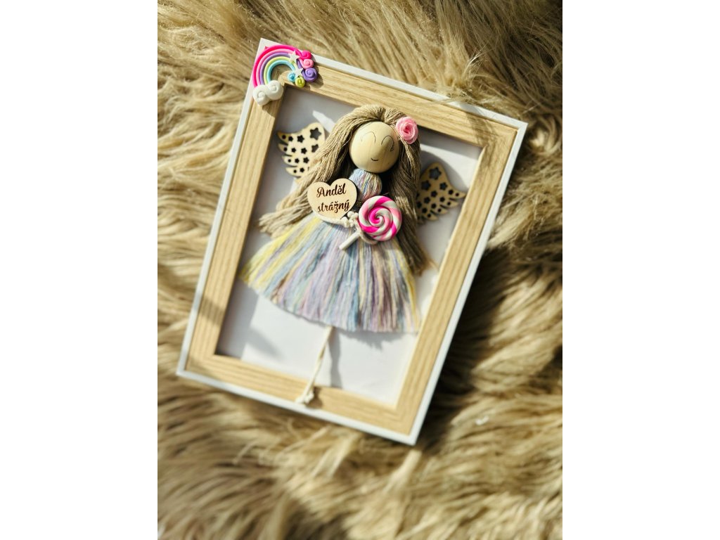 Duhový Anděl v rámečku s dekorem dřeva s textem uvnitř rámečku.