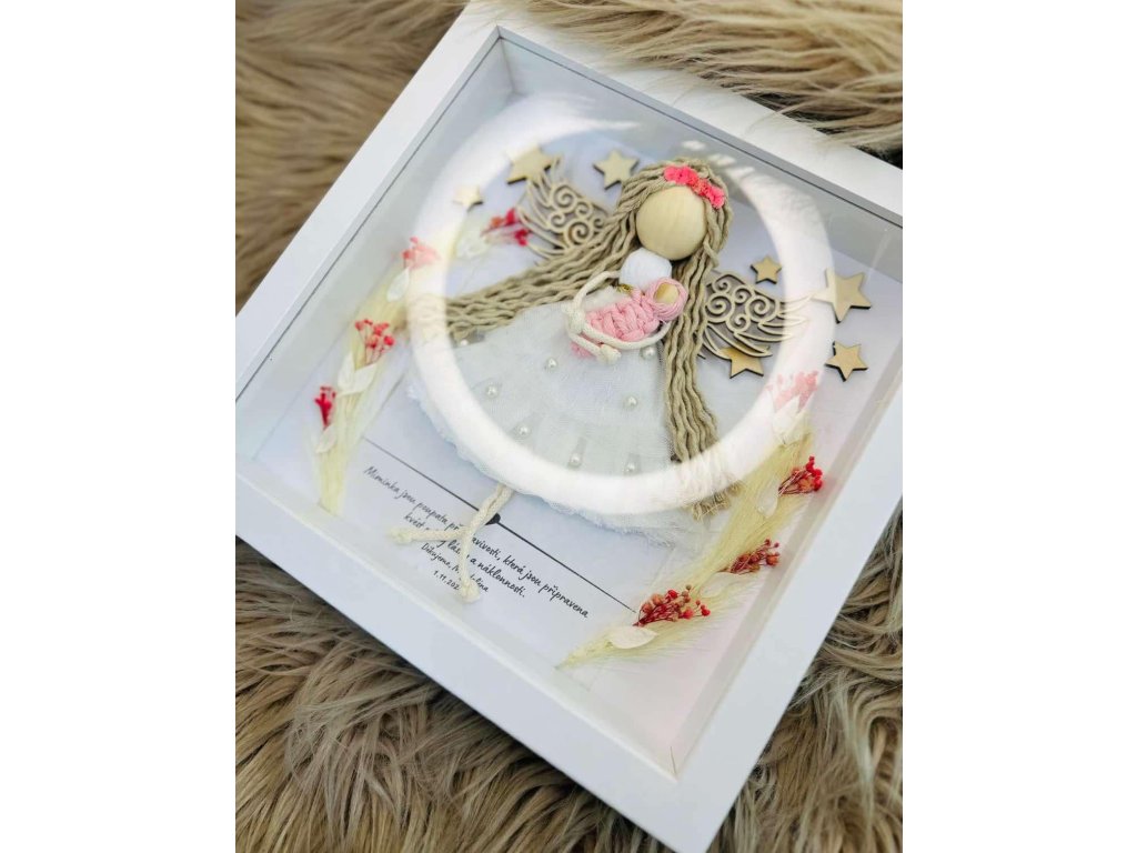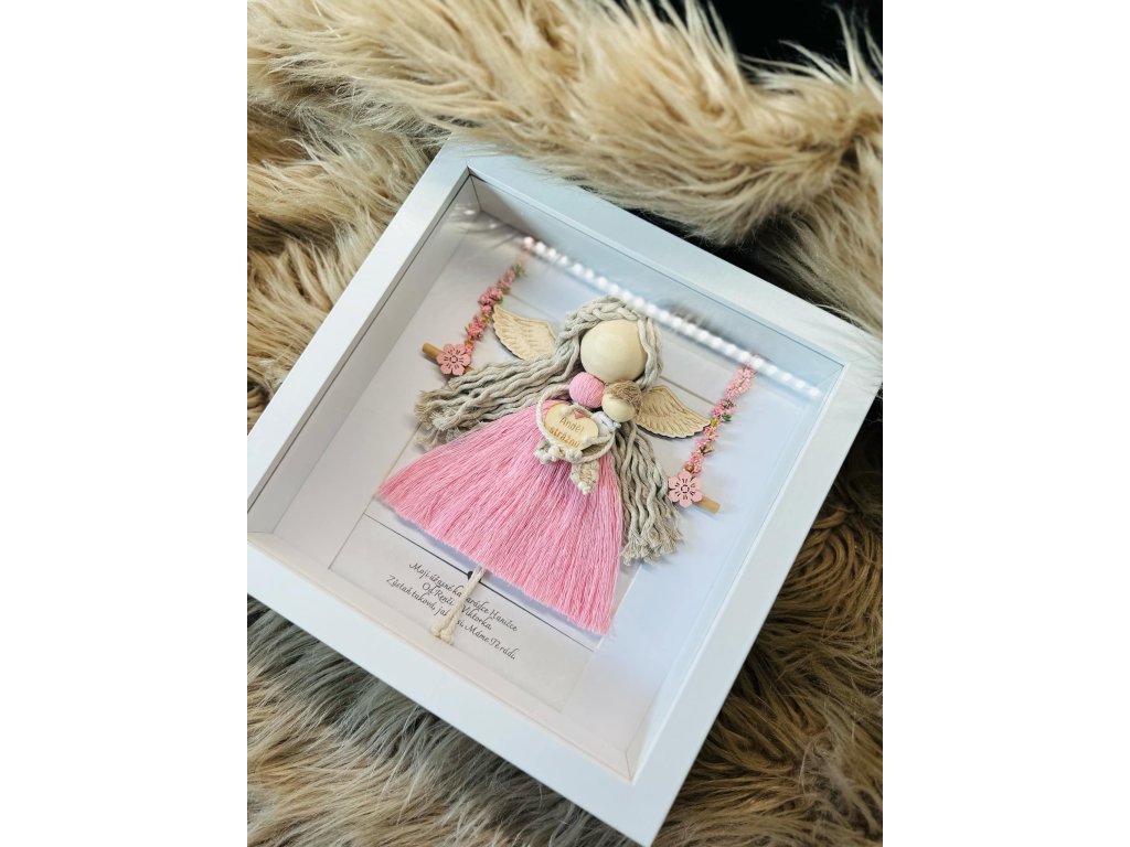 Anděl s miminkem v náručí v rámu za sklem/plexi