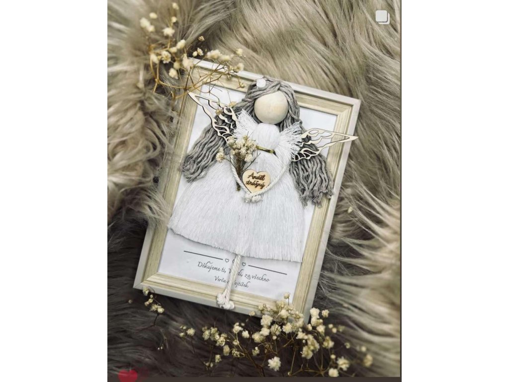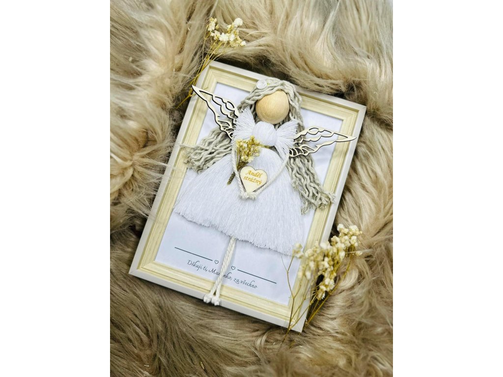 Anděl v rámečku s dekorem dřeva s textem uvnitř rámečku.
