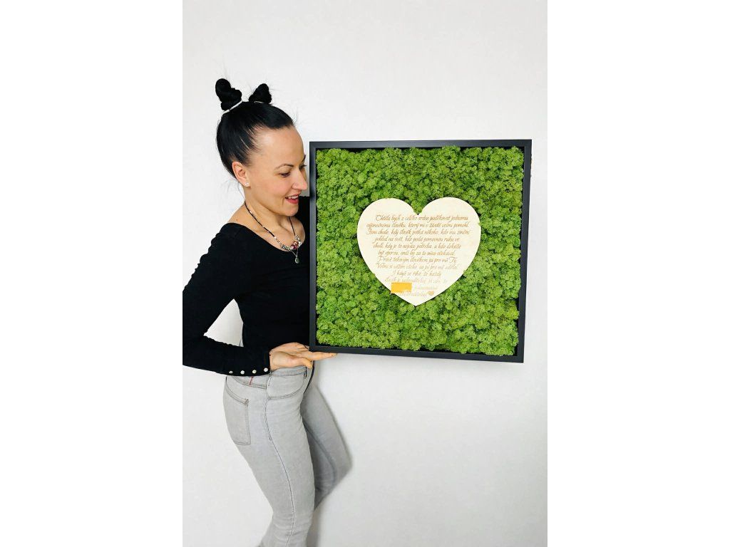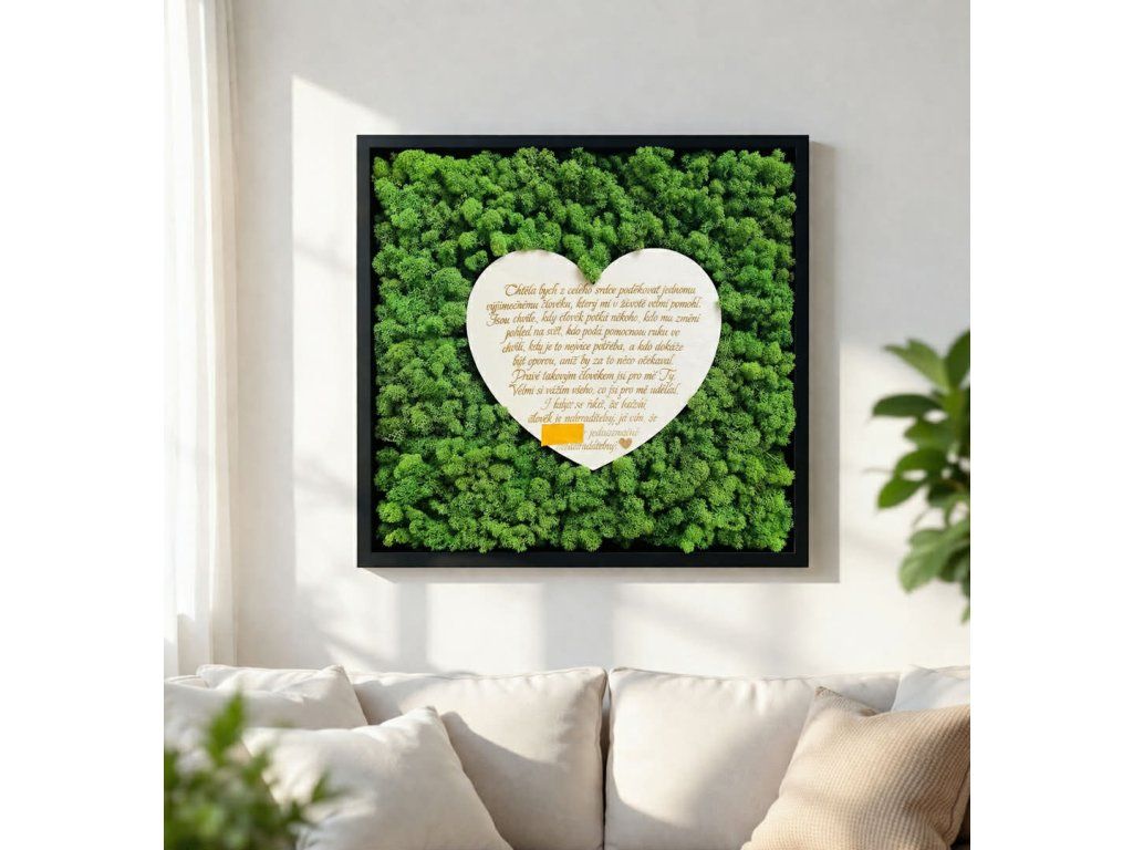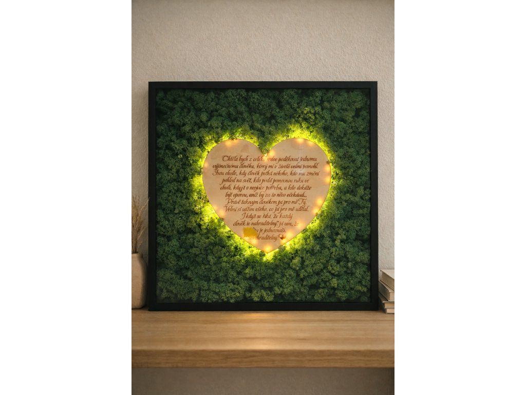 Mechová dekorace obohacená dřeveným srdcem a vaším vzkazem