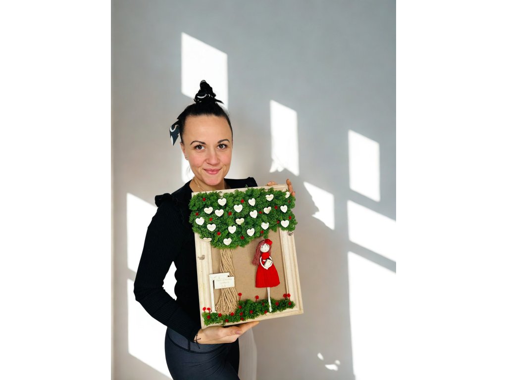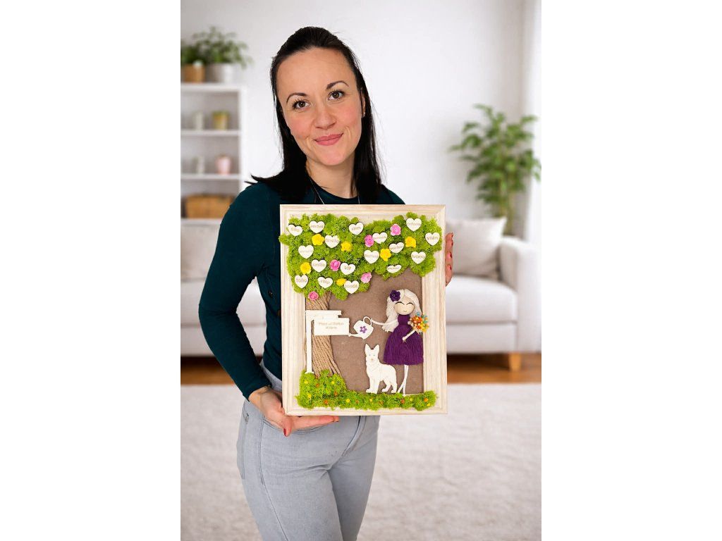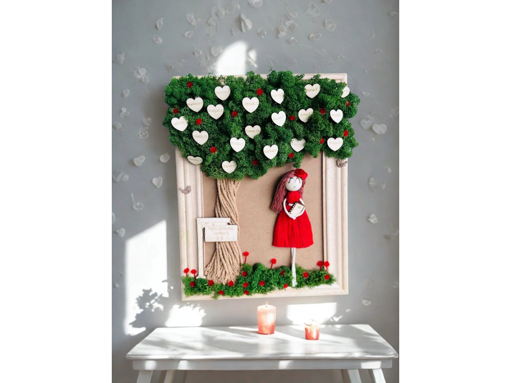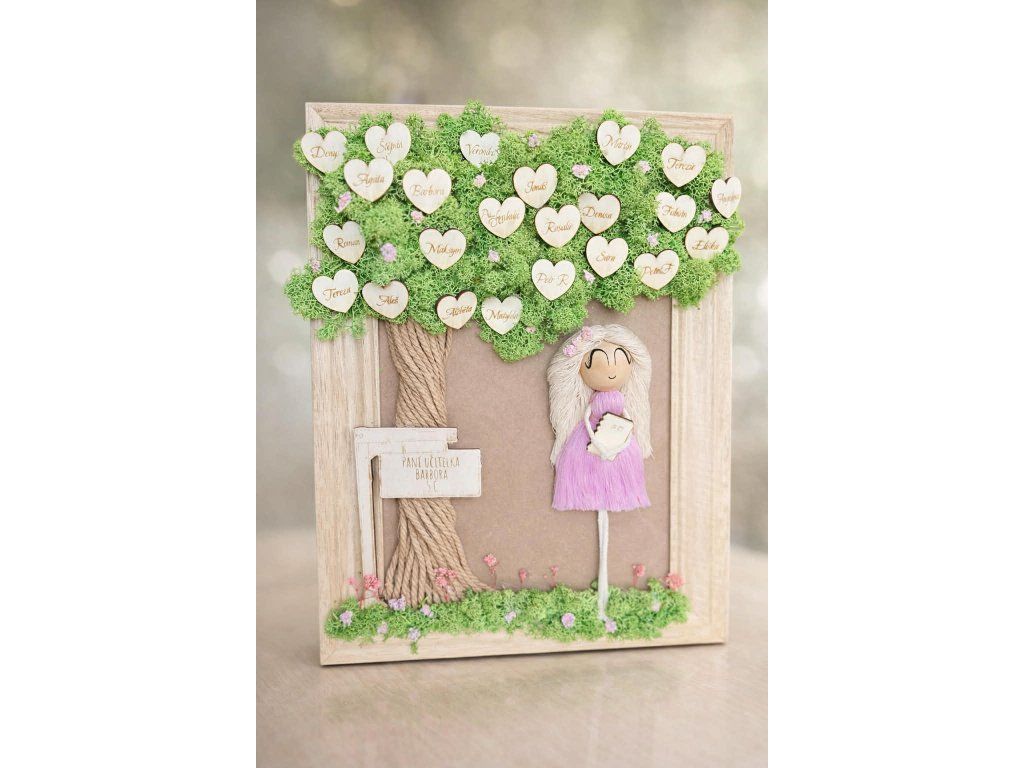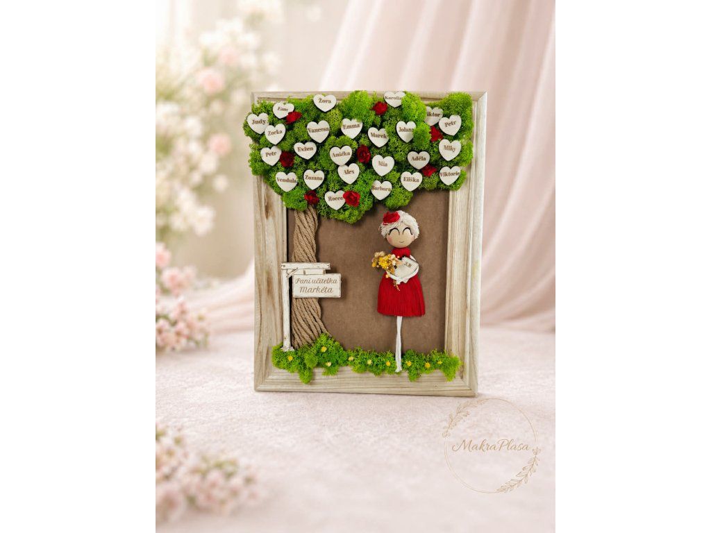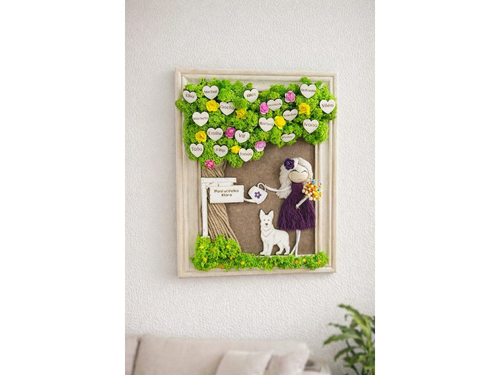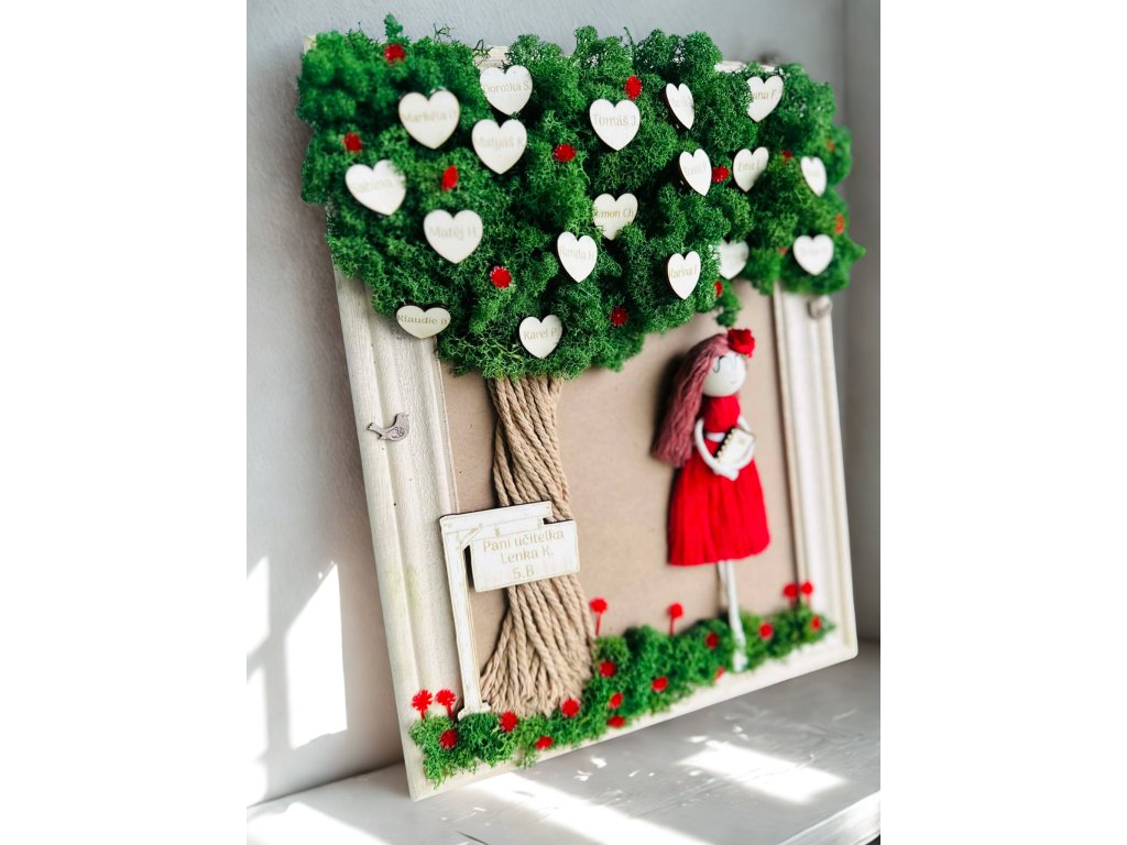 Na mechovém stromu jsou srdíčka se jmény žáků.