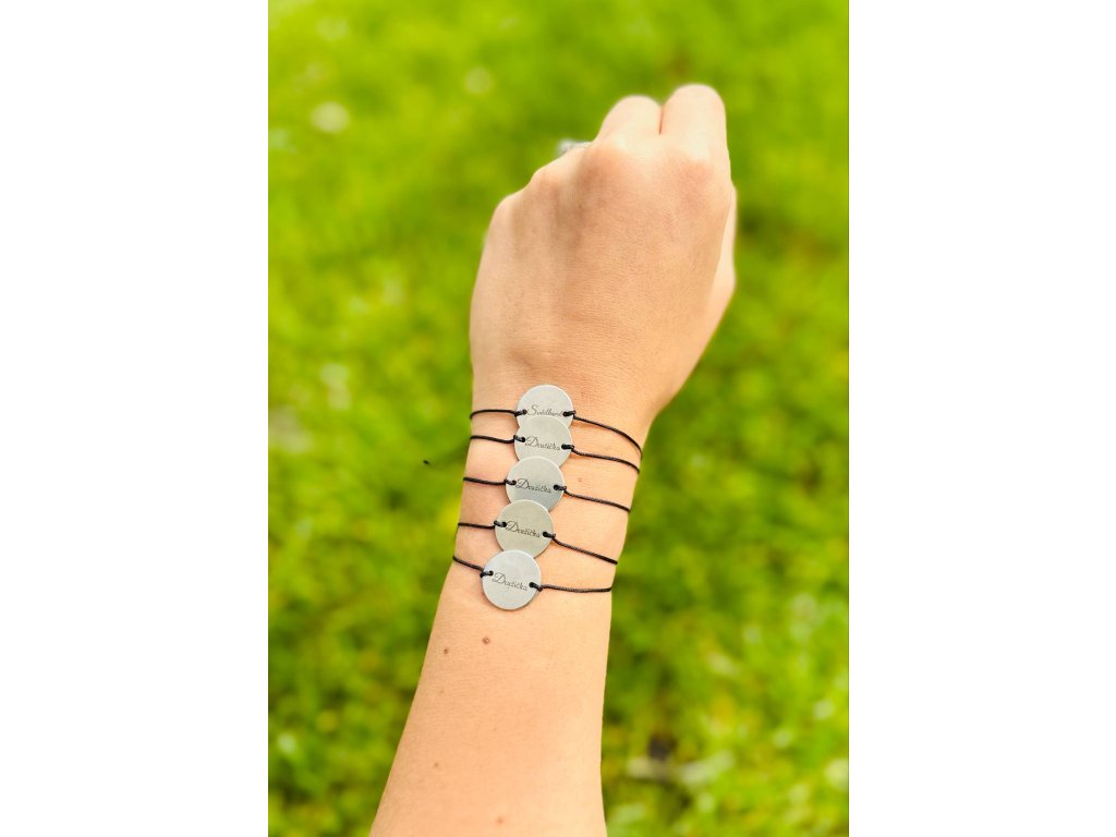 Náramek v kombinaci chirurgická ocel a černá šňůrka. Lze vypsat krátký text (Družička, svědkyně...... je zcela na Vás). Nebo lze dát fotku Vás, zvířat nebo loga. Prosím vepsat do poznámky.